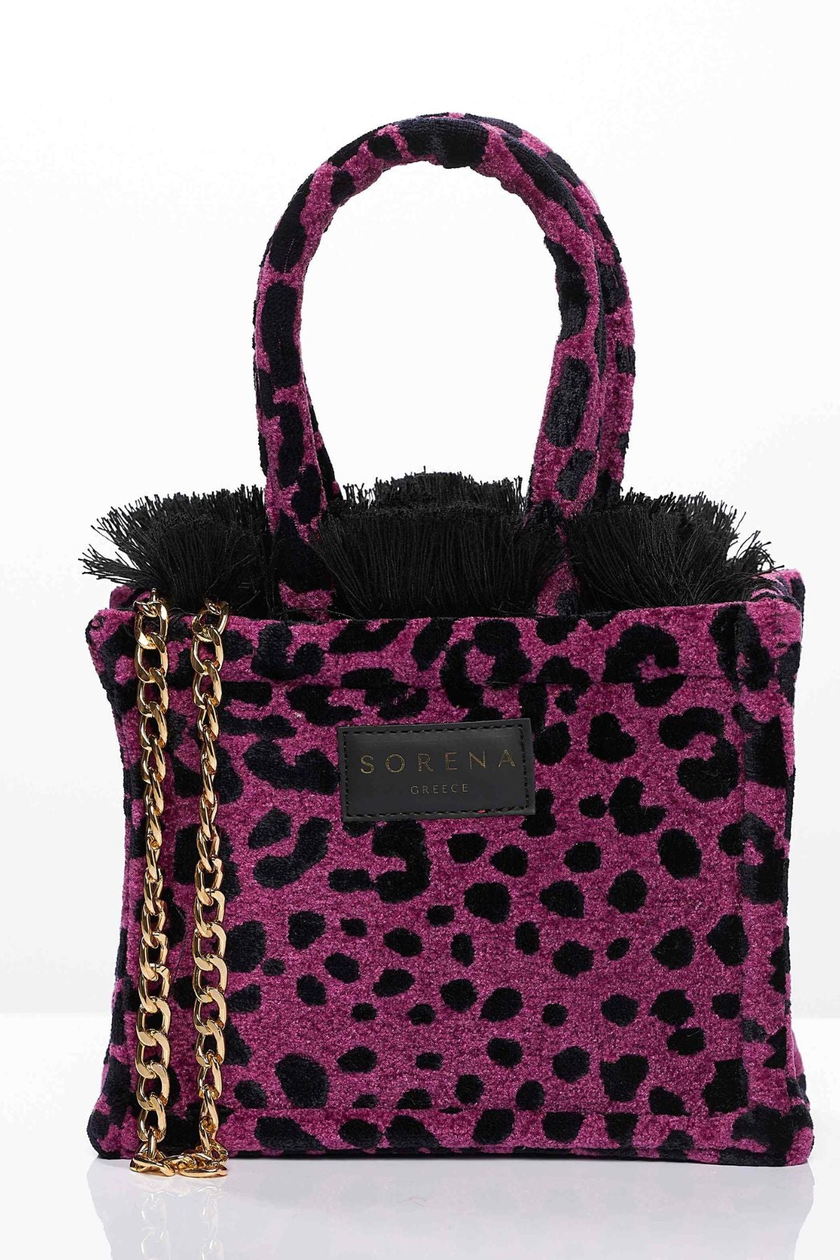 Elevate your accessory collection with the Sorena Mini Tote Bag in Leopard Velvet Magenta, crafted in Greece with meticulous attention to detail. This signature bag features a striking magenta leopard velvet exterior paired with a luxurious red velvet interior, offering both style and softness. The included gold chain strap adds a sophisticated touch and versatile wear options. Complete with a protective dust bag, this mini tote combines elegant design with practical care, making it a refined choice for discerning fashion enthusiasts.