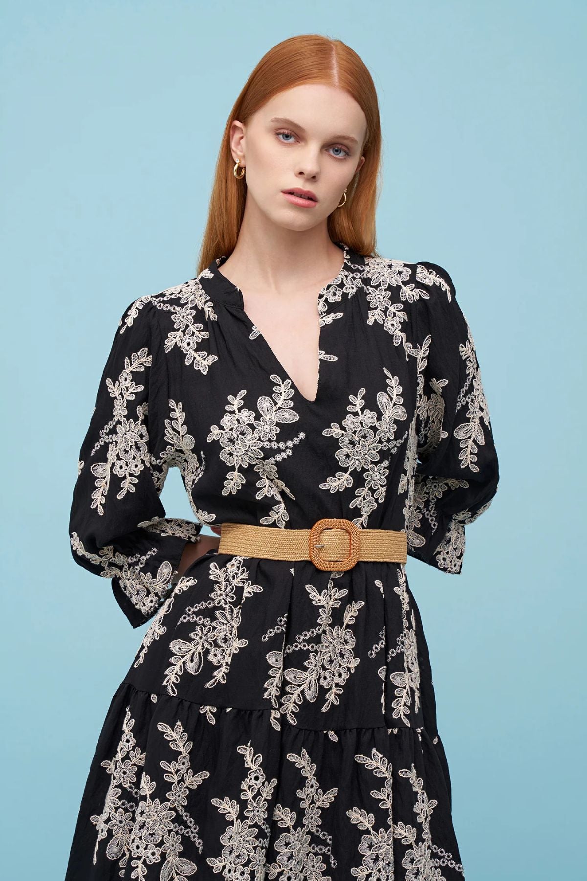 Astrid black woven dress featuring delicate ivory floral embroidery, a soft V-neckline, ruffled sleeves, and a tiered skirt for an elegant, feminine silhouette.