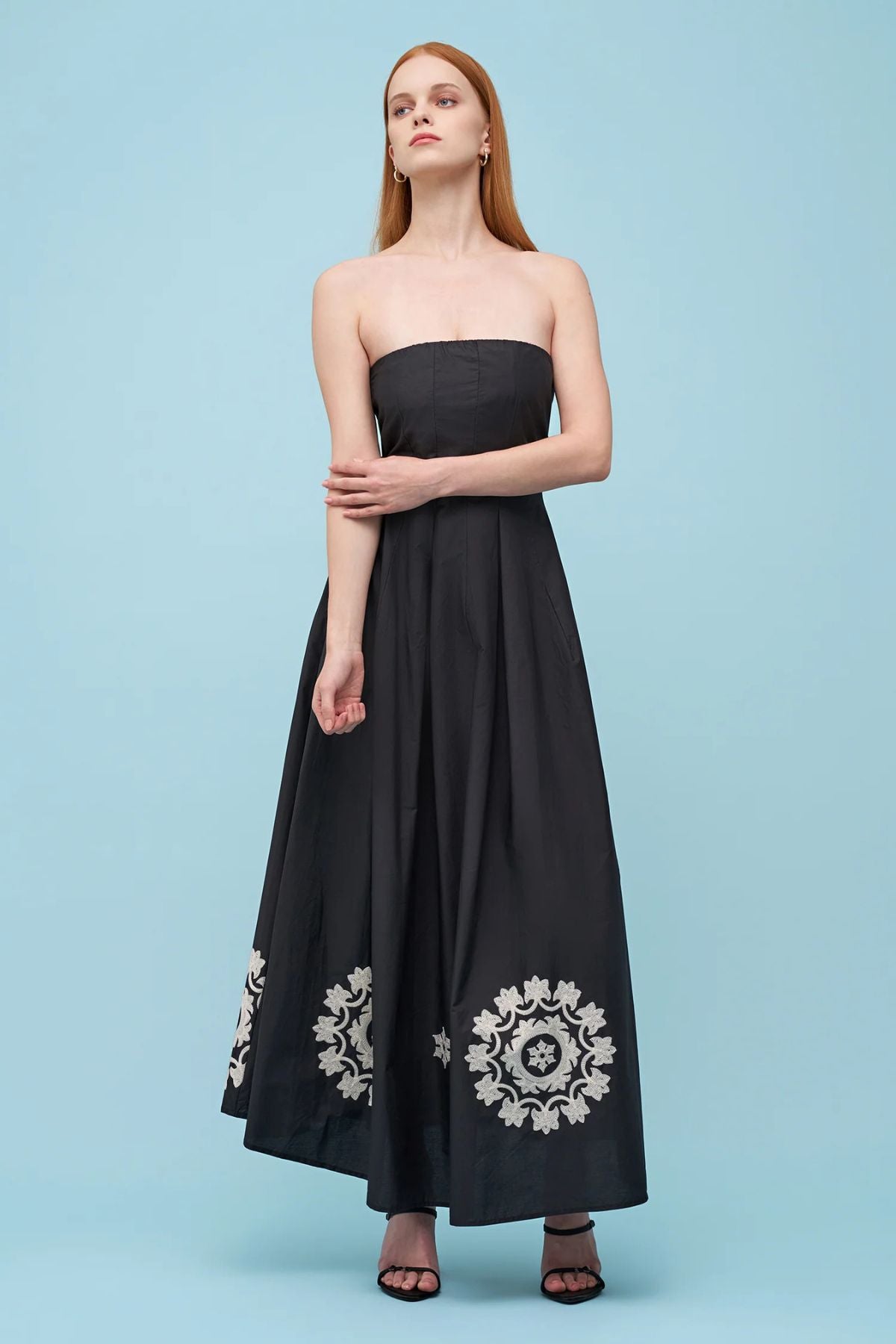 Elegant strapless woven dress in black featuring delicate white embroidered flowers along the hem. Perfect for sophisticated occasions and evening wear.