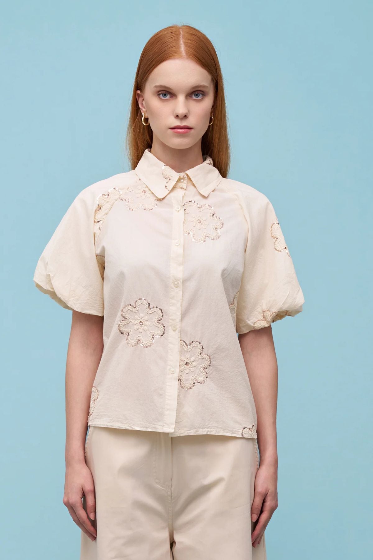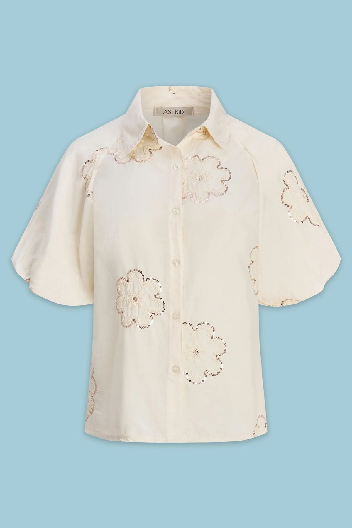 Astrid cream woven top featuring delicate tonal floral embroidery, a classic collar, button front, and soft puff sleeves for an elegant, feminine look.