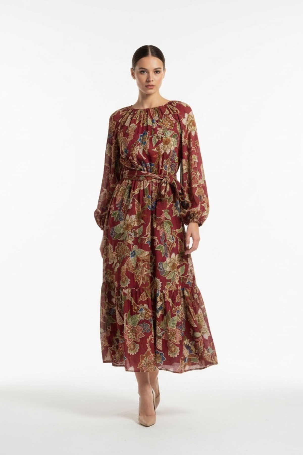 A bohemian-inspired tiered maxi dress in a rich red floral print, featuring airy long sleeves, a soft gathered neckline, and a matching tie belt for a flattering fit. Lightweight, feminine, and perfect for effortless everyday elegance.