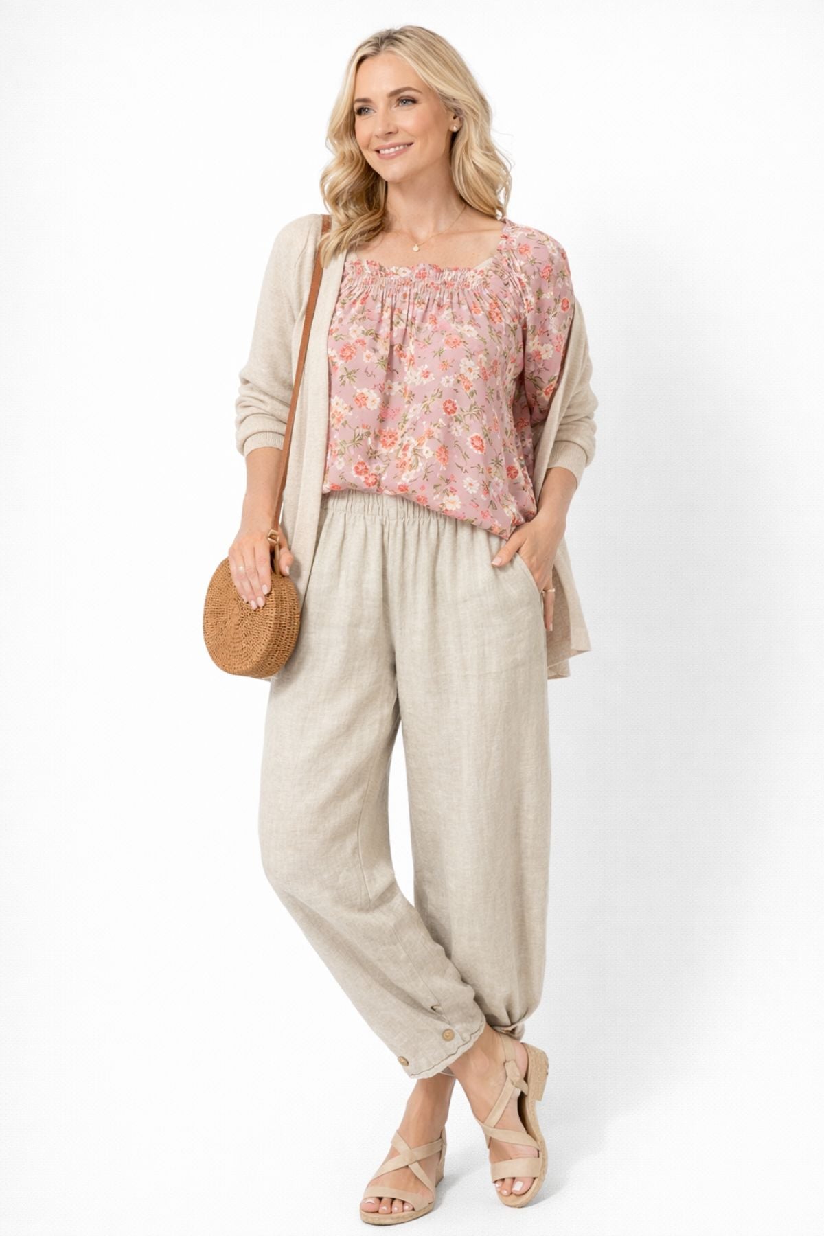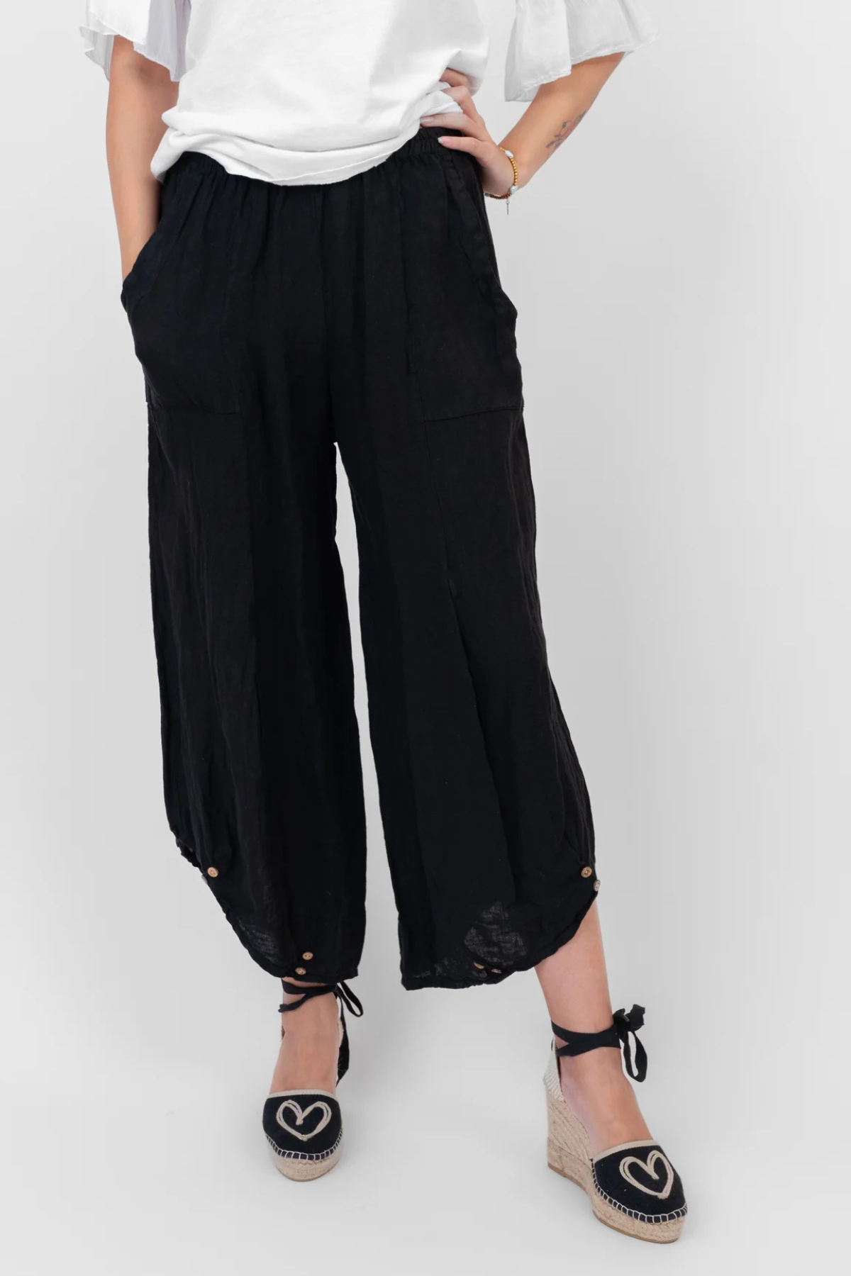 Me & Gee Pull-On Balloon Hem Capri, Italian linen pull-on capri with elastic waist, relaxed fit, soft balloon hem, and side pockets. Lightweight and easy.